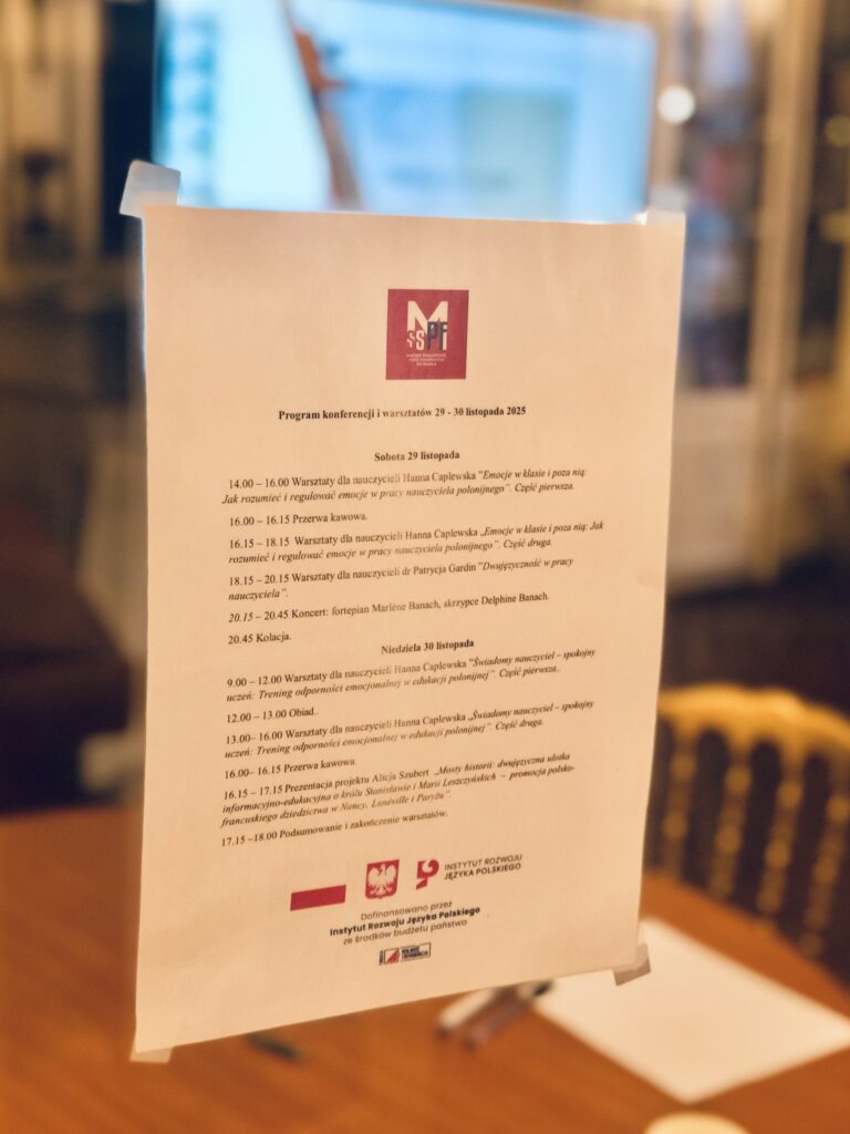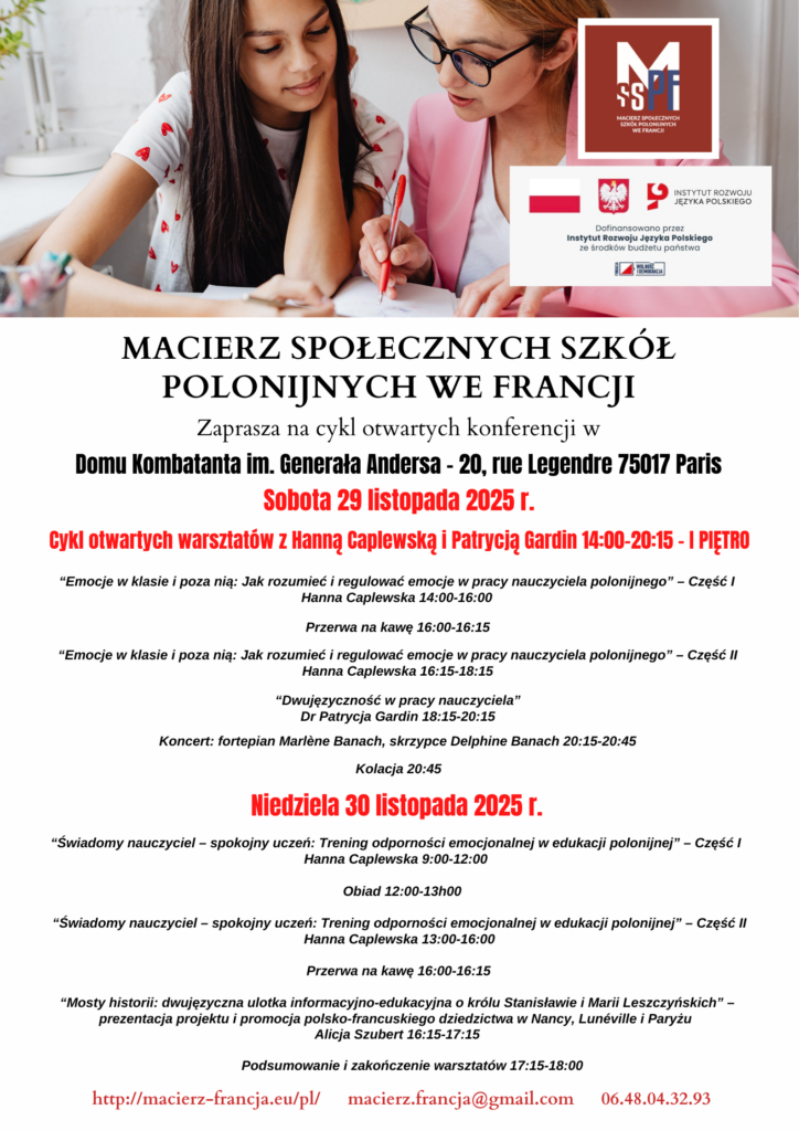 W sobotę oraz w niedzielę 29 i 30 listopada 2025 w Domu Kombatanta w Paryżu odbyło się wyjątkowe wydarzenie zorganizowane przez Macierz – Francja, łączące wiedzę, kulturę i muzykę. Warsztaty dla nauczycieli poprowadziły dwie znakomite specjalistki: Hanna Caplewska – psychoterapeutka, certyfikowany coach PCC ICF i doradca zawodowy oraz Patrycja Gardin – doktor nauk humanistycznych w dziedzinie językoznawstwa, wykładowczyni akademicka Centre de civilisation polonaise Sorbonne Université https://okp-sorbona.uw.edu.pl/
